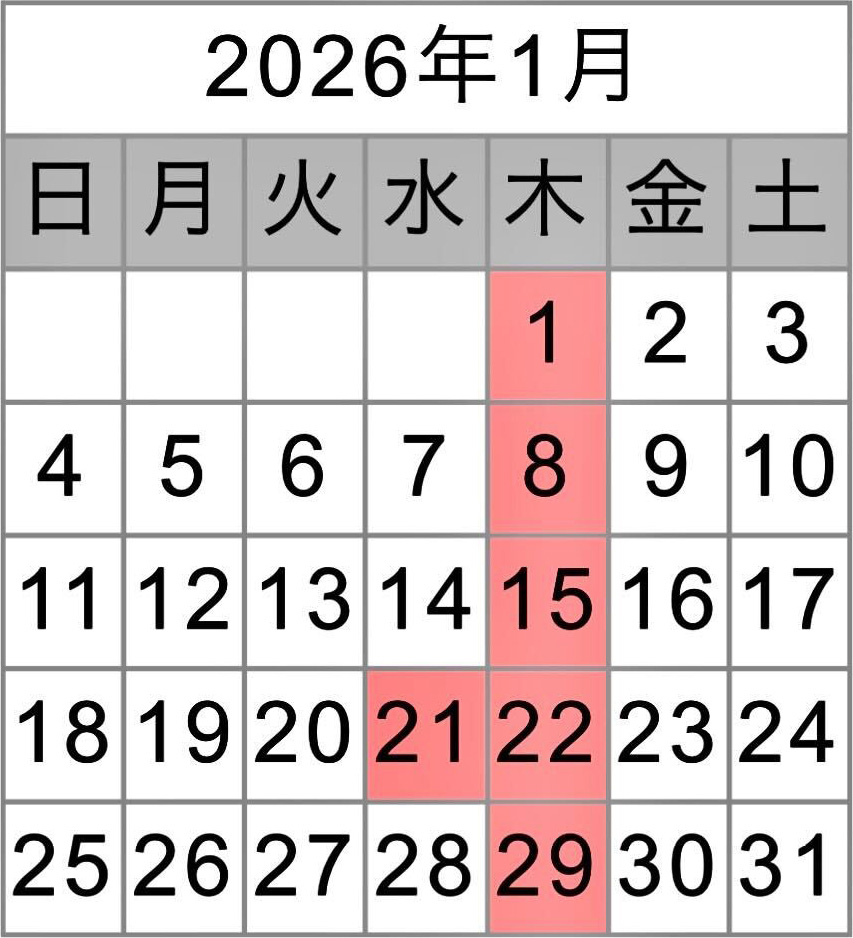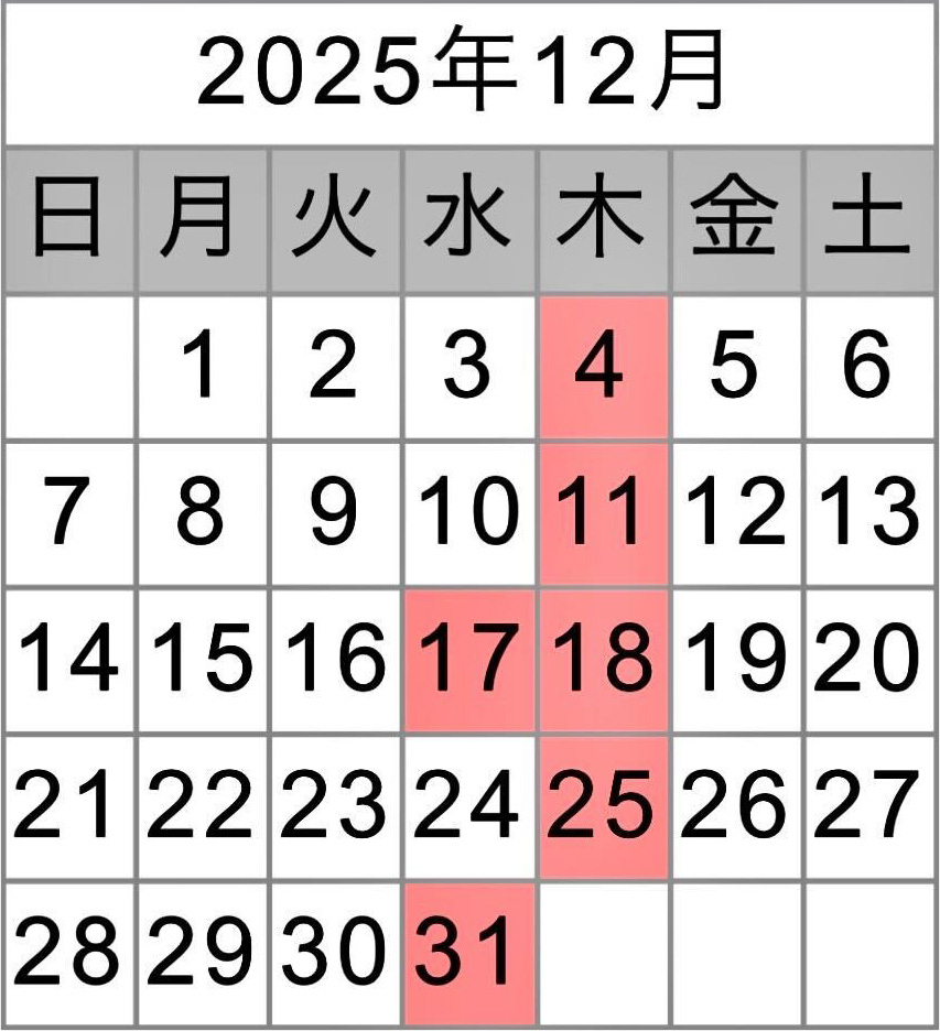 12月11日(木)、12月17日(水)、12月18日(木)、12月25日(木)、12月31日(水)、1月1日(木)は、店休日とさせて頂きます。1月2日(金)より営業します。