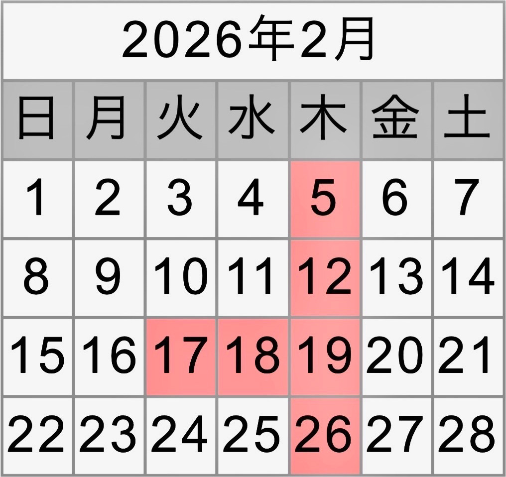 2月5日(木)、2月12日(木)、2月17日(火)、2月18日(水)、2月19日(木)、2月26日(木)は、店休日とさせて頂きます。