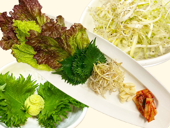 包み野菜セット ネギ山、ごまの葉、大葉、キムチ、ニンニク、サンチュのお得なセット。 | ¥830 |