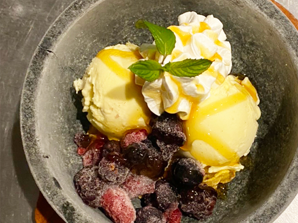 梅酒 とろっと深く、贅沢な甘さ。五年熟成の梅酒を一部使用し、かくし味にははちみつと塩を加えた、コク深い濃酵な味わいの梅酒。 | ¥520 |