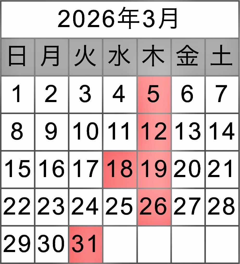 3月5日(木)、3月12日(木)、3月18日(水)、3月19日(木)、3月26日(木)、3月31日(火)は、店休日とさせて頂きます。